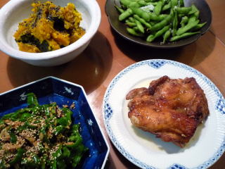 今年購入した日立の過熱水蒸気オーブンレンジ MRO-DV200付属の調理本のレシピです。にんにくや赤唐辛子入りのパンチの効いたおしょうゆベースのたれに半日ほど漬け込み、オーブンで焼くだけ。オート調理機能を使いましたが、スチームオーブンや網焼きグリル、レンジのコンビネーション加熱で、ほったらかしでもこんがりふっくらの焼き上がりでした♪あまり献立を考えずに買い物に出てしまったので、単品づかいのおかずばかりです(;^_^Aピーマンはツナ、塩昆布と一緒に炒めてご飯のお供に。かぼちゃはバターとねりごまでこってり味の煮物に。両方ともてんきち母ちゃんちの毎日ごはん(2)のレシピです。特にかぼちゃはおしょうゆ味とはまた違った濃厚さが美味で、娘の大好物あとは枝豆をゆでただけ* * * * * * * * * * * * * * * *連日のプール疲れがなかなかとれない中、在宅のお仕事が山積み。大学受験生は夏休みが天王山なので、減らしてもらってもかなりの量です。ほとんどの受験生はもう平成生まれなんだな~(遠い目)。自分の大学受験の頃とは、入試問題の傾向もずいぶん違っていて、脳細胞のピーク期からもう20年も経ってしまった私は、辞書を引き引き、夜な夜な頭をかかえています~。