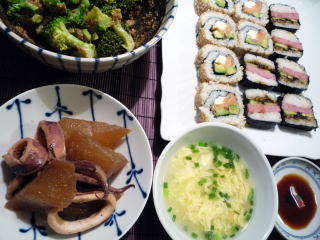 フィラデルフィアのクリームチーズのパッケージに書いてあったレシピです。スモークサーモンとアボカドが一緒に巻いてあります。ちなみに巻き方は「裏巻き」で、海苔は内側で外側が白ごま。巻く時に一工夫いりますが、食べるのはこちらのほうが、海苔が引きちぎれなくて、中身が飛び出すこともなく、食べやすいな~と思います。沖縄で買ってきたスパムの缶詰があったので、スパムむすびも作りました。きゅうりと海苔の佃煮をサンドしてぎゅーっと押し、全体を海苔で巻いてあります。あとは、急に肌寒いくらいの気候になったので、いか大根に。我が家のいか大根は、いかのわたも加えて煮込むので、こっくりとした色合いです。箸休めにはブロッコリーのごま和え。汁物はしらすと卵のかきたま汁。お寿司に結構ボリュームがあったので、あとはあっさり系を並べました。ホーメル スパムむすびメーカー付 スパム・ランチョンミート・レギュラー198gクラフト フィラデルフィアクリームチーズ 250g