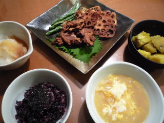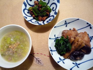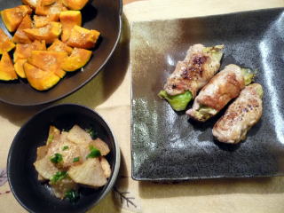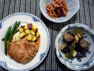 Yomeの楽チン・レシピを参考にしました。はちみつ入りのお醤油ベースのたれを回しかけ、レンジでチンするだけなのに、鶏肉がふんわりやわらかく、おいしい♪同じくレンジでチンしたさつまいもといんげんを付け合せにしました。あとは冷蔵庫にあるものでなんとかしのぎました、な献立。(我が家は火曜日がお買い物デーなので、月曜日は冷蔵庫が限りなく空っぽに近いのです(^o^;)なすとピーマン、長ねぎの鍋しぎに、れんこんのきんぴら。きんぴらは、味出しのベーコンのほか、ワインビネガーが味付けのポイント。米酢でもいいのですが、仕上げに少し加えると、味に奥行きが出て美味(*^_^*)