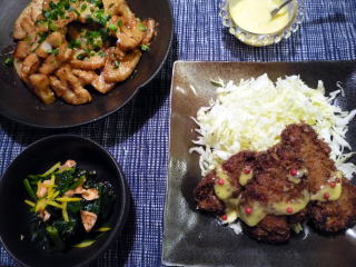 Yomeの楽チン・レシピを参考にしました。豚ヒレ肉をそぎ切りにして、ウスターソース&カレーパウダーを合わせた漬け汁に浸し、しっかり下味をつけてから、フライ衣をつけて揚げています。ウスターソースのおかげで、お肉がとてもやわらかくなり、旨みも増して、フツーのお値段のヒレ肉がワンランクアップの味になりました♪とんかつソースではなく、マヨネーズにはちみつを加えた甘いマヨネーズソースと、ピンクペッパーを散らしていただきましたこの組み合わせ、下味のついたしっかり味のヒレカツと相性抜群でした~小鉢はほうれん草と塩鮭のゆずポン酢和え。子供には鮭を多めに盛り付けます(;^_^Aあとはれんこんのクリーミーきんぴら。これもYomeの楽チン・レシピのもの。なんと、お味噌と牛乳で調味してありますこってり味なので、娘がいたく気に入り、半分くらいは娘のお腹に収まりました