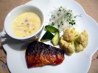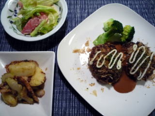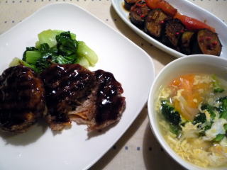 ピーラーで薄く切ったごぼうとにんじんがたっぷり入ったハンバーグ。Yomeご膳のレシピです。ソースは赤ワインやケチャップ、おしょうゆなどを合わせたもの。煮詰めすぎて濃ーい色になってしまいました(;^_^Aハンバーグソースがこってり味なので、付け合せは青梗菜の塩炒めであっさりと。副菜はなすとトマトのソテー。おろし玉ねぎ入りの甘辛いたれと、とろとろになったなすのコンビがおいしいー。こちらはYomeの楽チン・レシピを参考にしました。スープはあり合せの野菜(ブロッコリー、にんじん、たまねぎ)を鶏ガラスープで煮て、溶き卵を加え、片栗粉で軽くトロミをつけたもの。うちの子供たちはコンソメ味よりも鶏がらスープ味が好み。やわらかい味がいいのかなーー。