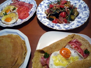 休みの日のお昼ごはんは麺類が多いので、今日はちょっと気分を変えてみました。ぱん工房くーぷみかさんの特別な日に焼きたいお気に入りパンのレシピです。薄く焼くので、見た目はクレープに似ていますが、そば粉+全粒粉で生地を作ってあるので、クレープよりもずっしり食べ応えがあり、とても香ばしく素朴な味わい。ただ、ちょっと生地が重く、薄く伸ばすのが難しく分厚くなってしまいました。レシピでは10枚焼けるはずが、なぜか7枚に・・・(^o^;のせる具は、チーズをのせたベーコンエッグ、トマトのほか、なす、ウィンナ、かぼちゃを炒めてパルメザンチーズで和えたものです。同じそば粉のガレットに市販のバニラアイス、自家製栗の渋皮煮、塩キャラメルソースをかけてデザートにただ、この塩キャラメルソース、私好みに塩を効かせ過ぎ、子供には「しょっぱすぎる!!」と不評でした・・・(;^_^Aたっぷりできてしまったので、残ったソース、さてどう使おう(@_@;)ぱん工房くーぷみかさんの特別な日に焼きたいお気に入りパン国内産無農薬栽培特選そば粉(細挽)【300g】