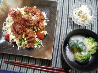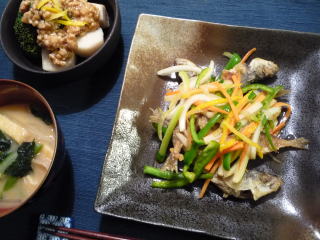 Yomeの楽チン・レシピ掲載のおかず。漬け汁は甘さ控えめで、おろし生姜の入ったあっさり味です。ひと山100円の豆あじを2つ買ってきて、せっせと下ごしらえをしました(;^_^Aあじはどんなに小さくても1尾ずつちゃんとぜいごが2箇所あるので(当たり前ですが)、25尾分のぜいご&内臓取りはけっこう時間がかかりました・・・。でもこれさえ済ましてしまえば、あとは揚げて漬け込むだけ。野菜もたっぷり採れるし、バランスのいいおかずです。小鉢はブロッコリーと里芋の肉あんかけ。鶏ひき肉を使って甘辛いあんを作り、レンジでチンした野菜にかけました。里芋はチンするときに市販のめんつゆをちょこっと回しかけてあります。お味噌汁は大根、ほうれん草、油揚げ。お味噌は半量を白味噌にして甘めにしました。甘めの合わせ味噌は、大根ととても相性がいいです
