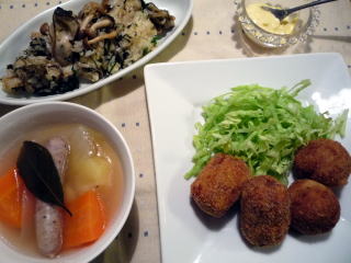 先日まとめて作って冷凍しておいた鶏挽き肉のそぼろとレンジでチンしてつぶした里芋を合わせたコロッケです。ちょっと里芋の量が少なかったので、急遽、かぼちゃのコロッケも追加することに。かぼちゃもレンジでチンしてからつぶして、カレーパウダーを混ぜ、玉ねぎとむきえびを炒めたものと合わせました。2口サイズくらいの小さめにして、衣も目の細かいタイプのパン粉でおつまみ風に。ご飯は、大人だけYomeカフェレシピのカキのバターピラフです。これはチャーハン式に炊いたご飯で作るので、子供は白いご飯という作り分けも可能。(うちの子供たちはカキが苦手なので・・・。)にんにくとバター、おしょうゆで味付けするので、と~ってもいい香りです細切りの海苔としそも加えて、さらに風味アップ。スープはソーセージポトフ。いただきもののソーセージで作ったのですが、教えてもらったレシピでは、使うのはたった5本。味が薄いんでは・・・?という心配は杞憂に終わりました。このソーセージ、とっても香り&味がよくて、少量でもとっても美味しいスープになりました(o^∀^o)丸いのが里芋、俵型がかぼちゃです。