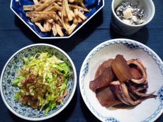 今日はお買い物デー。あまりに冷蔵庫がスカスカだったので、あれもこれもと買ったら、お会計がすごいことになって、ついでに荷物もすごいことになって、手がちぎれそうになりながら、ヨレヨレと帰宅。いかが安かったので、2杯買ってきました。いかの下ごしらえはやってしまえばなんてことはないのですが、夕方、時間に追われながらやらなきゃ・・・と思うと、少々面倒な気持ちになるので、買い物から帰ってきたらすぐその場でやってしまいます。ついでに、今日は煮込みも昼間のうちに開始!夕食前に煮返して、こっくりあめ色のいか大根になりました。我が家のいか大根はワタも入れるので、ちょっと濃厚な味です。いかはさっとゆがいたら一度取り出し、最後に加えてひと煮するだけにして、やわらかーく仕上げます。(うちの子供たちはちょっとでもかたくなると、「このいか、飲み込めな~い」ととたんに食べる意欲が下がるので・・・(>_