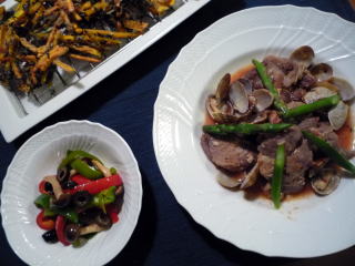 テニスの帰りによく立ち寄るスーパーは、魚介類が充実。今日は大粒のあさりが安かったので、2日前から塩豚にしている豚肩ロース肉と合わせて、煮込みにすることに。ルク鍋でカットした塩豚を焼き付けてから、あさりと白ワインを加えて軽く煮ます。冷凍庫で眠っていた半端に余ったトマトの水煮缶もプラスしました。お肉+貝なので、旨みは申し分ナシ!スープまでおいしい(スープがおいしい?)煮込みになりました。なんとなくイタリアンなメインになったので、サイドメニューはピーマンと黒オリーブのマリネにしてみました。さっと炒めたピーマンとにんにく、黒オリーブを白ワインビネガーとオリーブオイルに漬け込んでいます。予想されたことでしたが、これは子供にはまったく受けず・・・(^o^;あとは子供向けに千切りかぼちゃとひじき、桜海老のかき揚げ。てんきち母ちゃんちの毎日ごはん(3)のレシピです。揚げるとカサが減るので、ひじきがたっぷりとれます♪これも我が家は塩で食べました。残ったかき揚げは翌日、ごはんにのせ、天つゆをかけて丼に。