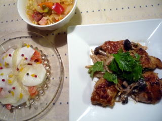 てんきち母ちゃんちの毎日ごはん(2)のレシピです。鶏むね肉を使うのですが、カレー粉などで下味をつけ、小麦粉をまぶしてソテーするので、ぱさつかず、とてもしっとり仕上がります♪仕上げにはマヨネーズとお醤油でコクをアップ。一緒に炒めたたっぷりの玉ねぎときのこ類もいい味出してくれます。スープはキャベツやパプリカ、セロリ、にんじんなどなど、たっぷりの野菜が入ったミネストローネ。味出しはブロックベーコンです。ほのかに野菜の甘みが感じられるやさしい味は、娘のお気に入り。今日は4回もお代わりしました(@_@;)サラダはかぶのマリネ。Yomeの楽チン・レシピ(2)を参考にしました。スライスしたかぶをスモークサーモン&玉ねぎと一緒にミキサーで作った玉ねぎドレッシングに漬け込んであります。大人には、ピンク&グリーンペッパーと柚子の皮を散らしました。このドレッシングは、玉ねぎやオリーブオイル、砂糖などをガガッとミキサーにかけるだけなのですが、本当に美味しい~。玉ねぎドレッシングとはいえ、甘めなので、子供にも食べやすい味です。