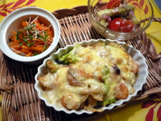 このところの急激な寒さに、久しぶりに熱々のグラタンが食べたくなりました具は、マカロニのほか、エビ、玉ねぎ、マッシュルーム、ブロッコリーと野菜もたっぷり。ホワイトソースはバター、小麦粉、牛乳で、ややゆるめに作ってあります。具を和えた後、グラタン皿に盛った後にもソースを回しかけて、オーブンへ。昔は出来たては絶対に食べられなかった猫舌の子供たちも、気がつけば、ハフハフ言いながら頑張って食べてました(;^_^Aサラダは千切りのにんじんとブロッコリースプラウトと合わせ、さらにすりおろしにんじん入りのドレッシングで和えたサラダ。もう一品は、圧力鍋で蒸したなすをみじん切りの紫玉ねぎ、カットしたプチトマトと和えて、はちみつ入りの甘いドレッシングでマリネにしたもの。
