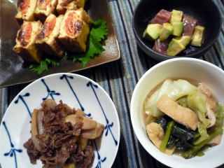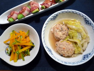 本棚の整理をしていたら、結婚前に買ったオレンジページの基本の和食が出てきました。私の持っている初版本は15年くらい前になるので、さすがにもう売っていないだろうと思って検索したら、再販されていました。魚のさばき方とか、基本的なことが写真入りで丁寧に解説されていて、500円とは思えない充実した内容。ぼろぼろになるくらい当時愛用していた本なので、ちょっと嬉しかったです。その本のレシピで、久しぶりに作ってみました。白菜はたっぷり1/4株。鶏だんごはみじん切りのにんじんときくらげ、長ネギ入りで、彩りも食感も楽しめます。鶏肉の旨みを十分にすった白菜が甘くて美味。娘はこの白菜を何度もおかわりしていました(o^∀^o)小鉢はかぼちゃの酢の物。千切りにしてさっとゆでたかぼちゃを生姜入りの甘酢に漬けたもの。あとは、朝食のサンドイッチに使ったアボカドが残っていたので、ベーコンで巻いて、ポン酢をかけて小さなおかずに。