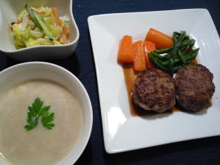 Yomeご膳のレシピです。みじん切りの代わりにすりおろした玉ねぎが入っているので、しっとりジューシーなハンバーグです。今日は娘がスイミングから帰宅後、珍しく発熱!いつものハンバーグよりも食べやすいかな~と思って作りましたが、本人はそれどころではなかったらしく、夕食はみかんを3個立て続けに食べて、またお布団へ・・・。付け合せはにんじんといんげんのグラッセ。サラダはキャベツときゅうり、にんじんを塩もみしてから、ハムを加え、すし酢&マヨネーズで和えたコールスロー。スープはてんきち母ちゃんちの毎日ごはん(2)の舞茸のポタージュをマッシュルームに変更して作ったもの。じゃがいものポタージュが基本になっていますが、マッシュルームが入ると、驚くほど香りが違ってきますo(^-^)oちょっと大人味のポタージュでした。Yomeご膳