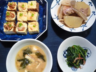Yomeご膳のレシピです。根菜類を全部炒めてから煮るだけなので、とっても簡単!おおぶりに切った大根も下ゆでなしです。それでも出来上がりはほどよく味が染みていて、いい感じでした。見た目は和風ですが、味付けは鶏がらスープの素やオイスターソースを使っています。コクがあって、少量の鶏肉でも十分おいしくいただけました♪おつまみっぽいおかずの、厚揚げの明太子チーズ焼き。厚揚げのくり抜いた中身とそぎ落とした表面は、お味噌汁に入ってますo(^-^)o明太子が足りなかったので、キムチを刻んで入れたキムチバージョンも作ってみました。ほうれん草は桜海老と合わせ、ごま油とおろしにんにく、おしょうゆで和えた中華風のお浸しに。純和風のお浸しよりも子供たちにも食べやすいようです。