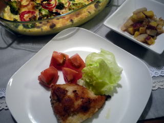 鶏のむね肉に切り込みを入れ、市販のバジルペーストを塗り、パン粉をまぶしてフライパンで焼きます。フライ衣をつける手間もなく、とても簡単!でも、ちゃんとフライのようなサクサク感が楽しめ、夫もお気に入りのメニュー。バジルペーストのおかげで、特に味付けをしなくてもOKなのもうれしい♪サイドメニューは、使いそびれていた生クリームがあったので、キッシュにしました。長芋、ブロッコリー、しめじ、赤ピーマンを生のまま耐熱皿に並べ、生クリーム、卵、牛乳をあわせたキッシュだねを流し込んでオーブンへ入れれば出来上がり。キッシュはパイ生地作りを省けばかなりラクです。サラダはれんこんとさつまいものマリネ。ゆでたれんこんとさつまいも、塩もみした玉ねぎをバルサミコ酢やオリーブオイル、おしょうゆを合わせたドレッシングで和えてあります。和のイメージが強いれんこんとさつまいもですが、こんな洋風なドレッシングとも意外と好相性です。