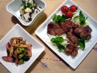 てんきち母ちゃんちの毎日ごはん(3)のレシピです。豚肩ロース肉の塊をカットして竜田揚げにしています。下味に米酢を使っているので、厚く切ったお肉もしっとりやわらか。カタマリのお肉があまり得意ではない子供たちにも好評でした。少食の息子も「これ、おいしいねー」とおかわりしたほど。(夫と同じく普段私の料理にはほとんどノーコメントなので、あえて感想を述べるおかずは要チェックなのです)小鉢は長いもと明太子、ひじきをマヨネーズで和えたもの。このところ、頻繁に作っている小さなおかずです。辛いものが一切ダメな息子もこのくらいの量なら明太子でもOKになってきました。炒め物はブロッコリー、ごぼう、ソーセージという組み合わせ。野菜類はあらかじめレンジで火を通してあるので、さっと炒めて、ポン酢を回しかければ出来上がり。* * * * * * * * * * * * * * * *海外ドラマ「デスパレートな妻たち」、ついにシーズン3まで全話見終わりましたありえない展開の連続なんですが、見事にハマってしまいました。シーズン3もものすごーく気になる終わり方だったので、早く次が見たい~!次は海外ドラマ好きの友人オススメの「HEROES」を借りたのですが、3話まで見たものの、どうもまだピンと来ません(;^_^A「15話くらいまで我慢してみれば一気に面白くなるよ」と言われたのですが、まだ先は長い・・・。