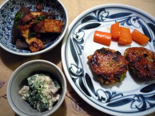 てんきち母ちゃんちの毎日ごはん(3)のレシピです。鶏のつくねのたねにたっぷり1個分の刻みブロッコリーが入っています。マヨネーズや粒マスタードが隠し味に入ってます。味付けは甘辛い照り焼き味なので、子供ウケもバッチリ。娘は今回、これで初めてブロッコリーを食べました♪付け合せは息子が大好きなにんじんのグラッセ。これを出すと、メインのおかずを差し置いて、まずこれに手をつけるほどお気に入りです。あとは同じ本のレシピで、厚揚げとこんにゃくの炒めもの。にんにくとベーコン、パセリ、粒マスタード、めんつゆで味付け。和洋折衷の味ですが、不思議とまとまっていました。小鉢はほうれん草とエリンギの白和え。2年ほど前にとある講習会で習ったものですが、すりごまやマヨネーズが入ったコクのある白和え衣は、すっかり我が家の定番となりました。* * * * * * * * * * * * * * * *今日は来週娘の学校で行われるバザーの準備。作業をしながらも、めぼしいものはその場でお買い上げしたりして、和気藹々と楽しみながら作業してきました。お昼は久々に顔を合わせた友人とランチへ。小学校に上がると働くママがぐんと増えて、なかなかのんびりランチする機会も減っていたのですが、今日はそんなメンバーとも話ができて楽しかった仕事してるママはやっぱりパワフルで、時間の使い方が上手。5時半起きは真似出来そうにありませんが・・・(;^_^A