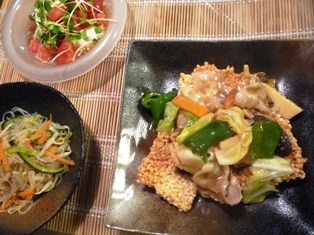 中華おこげ 野菜あんかけ(中華のおかずと飲茶より)春雨サラダ(オレンジページネットより)冷奴のゼリーあんかけ(中華のおかずと飲茶より) * * * * * * * * * * * * *先日、富澤商店で製菓材料を買ったときに、ふと気になって一緒に注文したおこげ。これは出来たてを食べたいので、家族が揃う週末に使おうと思って早や数週間・・・(-_-;)本日ようやく日の目を見ましたあんの具は味だしの豚バラ肉のほか、キャベツ、たけのこ、にんじん、長ねぎ、ピーマンなど。揚げたてのおこげにあんをかけると、ちゃんとジュッといういい音がしました♪春雨サラダは、大根、もやし、にんじん、きゅうりなど、たっぷりの野菜入り。大人は自家製食べるラー油をかけていただきました(*^_^*)冷奴はひと手間かけたゼリー仕立てのたれをかけています。お砂糖や米酢、お醤油を加えたコンソメ液をゼラチンでゆるく固めて、お豆腐にのせて、さらに野菜をトッピング。夏らしいのどごしのいい冷奴です。 おこげ 10枚ケンコーコムさんでも扱っていました。