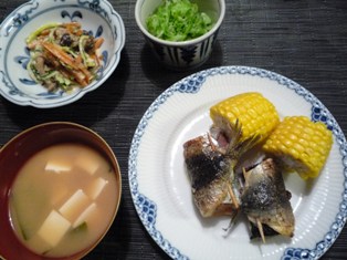 あじのしそ巻き揚げゆで枝豆&とうもろこしあさりとキャベツのスープ(こうちゃんの簡単料理レシピ(3)より) * * * * * * * * * * * * *三枚におろしたあじに塩・こしょうをして、しそをのせてくるくる巻き、片栗粉をまぶして揚げました。骨をすべて骨抜きで取ってあるので、子どもにも食べやすいです。 スープはあさりを酒蒸しにしてあさりのエキスたっぷりのスープを取り、あさりを取り出してキャベツとお豆腐を煮て、最後にあさりを戻し入れて仕上げます。味付けは少量のお塩とお醤油のみで、十分おいしい~本日の塾弁です。下味をつけた豚こまに片栗粉をまぶして揚げた唐揚げがメイン。お隣はキャベツのゆかり和え、そしてにんじんとピーマンのきんぴらです。今日はお弁当には不向きな献立だったので、まったくの別メニューでした。