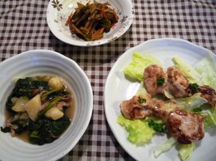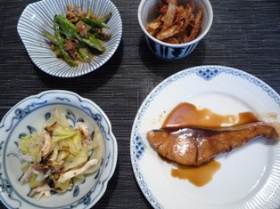 ぶりの照り焼きキャベツと鶏酒蒸しの塩昆布&梅干し和え(簡単、手間なし、手早く作れる!はらぺこレシピより)絹さやとアスパラのごまくるみ和え(たかこ@caramel milk teaさんのデリごはんとカフェデザートのレシピより)ごぼうの唐揚げ明太和え(てんきち母ちゃんちの毎日ごはん(2)より) * * * * * * * * * * * * *