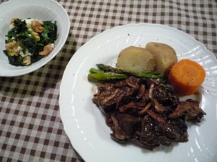 牛すね肉の赤ワイン煮 蒸し野菜添え(まいにち、圧力鍋より)ほうれん草とクリームチーズ、くるみのサラダ(てんきち母ちゃんちの毎日ごはんより) * * * * * * * * * * * * *圧力鍋の二段調理で作りました。下段でまいたけやしめじを加えた赤ワインソースで牛肉を煮込み、蒸しカゴをセットしてその中で野菜を蒸しています。野菜はおおぶりに切ってもしっかり蒸しあがって、とっても甘~いほうれん草の和え物は、クリームチーズとローストしたくるみを合わせた洋風のお浸し。大人には好評ですが、子どもたちにはイマイチ。子ども用には桜エビとめんつゆ、ごま油、おろしにんにくを加えた中華風にしました。今日の献立には絶対レーズン入りのカンパーニュ!と思って、朝から冷蔵発酵で生地を準備していたのに、イマイチ発酵の進みが悪く、結局焼きあがったのは夕食後((+_+))赤ワイン煮と一緒に食べるのは翌朝に持ち越しました。パンに塗っているのはクリームチーズ。朝からハイカロリーです