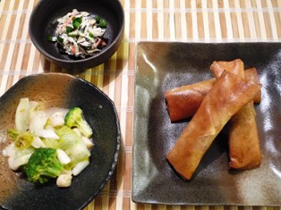 五目春巻きレタスと帆立、ブロッコリーの塩炒め大根とひじき、かにかまのごまマヨサラダ * * * * * * * * * * * * *久しぶりに春巻きを作りました。火を通した具を一旦冷ましてから包んで、さらに揚げる・・・というプロセスがなんとなく面倒で、あまり作っていなかったのです(^_^;)時間に余裕があれば、手間としてはさほどないし、材料もありあわせでOKだし、けっこう便利かもと思い直しました。何より、カリカリの食感が好きな娘がとーってもよく食べてくれたので、作りがいがありました(*^_^*)レタスが少ししなびてきたので、火を通して食べました。冷凍の小柱とブロッコリーを合わせて、塩とお酒でシンプルに味付け。こってりした揚げもののお供にちょうどよかったです。サラダは塩もみ大根とかにかま、戻してからレンジでチンしたひじきをすりごま、マヨネーズ、お醤油で和えています。地味ですが、子どもたちも大好きなサラダです。