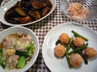 エビだんご&アスパラ(YOMEの楽チン・レシピ(2)より)肉ワンタン&青梗菜塩もみ大根の明太子レモン和えなすの中華風揚げ浸し(ごちそうさまが、ききたくて。より) * * * * * * * * * * * * *エビをフープロにかけて、すり身にし、マヨネーズ、お酒、塩・こしょうで味付けしたたねに片栗粉をまぶして揚げています。簡単なのに、エビのうまみがいっぱいでおいしい~ワンタンは手間がかかる割に餃子のようなメインにはならず、なんとなく中途半端なポジションでうちではあまり作る機会がないのですが、今日はメインのエビだんごが少なめだったので、バランスいいかな?と思って作りました。つるつるとのどごしがよかったのがツボのようで、子どもたちに大好評!(^^)!もっと頻繁に作ってあげればよかった^_^;なすの揚げ煮は夏には何度も作っている大好きなおかず。たっぷり作って、たいていは翌日のお昼にはそうめんのお供にしています。今日もせっせとなす10個分揚げました