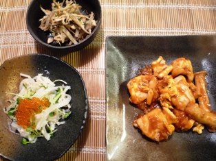 いかのチリソース卵入り大根とカニ缶、かいわれ菜のサラダ いくらのせごぼうとツナのサラダ(トイロ家のおいしいごはんより) * * * * * * * * * * * * *