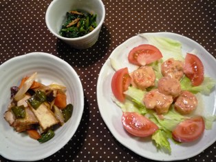 エビマヨ(トイロ家のおいしいごはんより)厚揚げの酢豚風(たかこ@caramel milk teaさんのデリごはんとカフェデザートのレシピより)ほうれん草と桜エビのにんにく醤油和え(てんきち母ちゃんちの毎日ごはんより) * * * * * * * * * * * * *