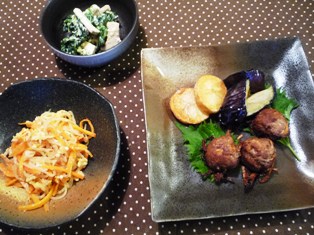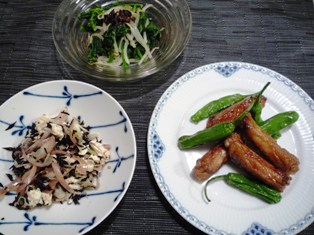 手羽中の揚げ煮(てんきち母ちゃんちの毎日ごはん(2)より)お豆腐とひじきのサラダ(たかこ@caramel milk teaさんのデリごはんとカフェデザートのレシピより)ほうれん草ともやしの和え物(てんきち母ちゃんブログより) * * * * * * * * * * * * *息子のテニススクールの待ち時間に、普段は行かないスーパーに寄りました。手羽中が手に入ったので、さっそく夕食に。片栗粉をまぶして揚げてから、バルサミコ酢や黒糖などが入ったうまみたっぷりの甘辛味を絡めています。ひと手間かかりますが、とーってもおいしくてお気に入り。しっかり揚げることで、身離れもよくなり、骨付きでも食べやすいです。サラダは、水切りして崩したお豆腐とゆでたひじきをアンチョビとオリーブオイルで和えた斬新な味!みょうがも加えて、和とイタリアンの折衷となりました♪ほうれん草の和え物の味付けは、基本は鶏ガラスープで塩味ですが、大人用には自家製食べラーをトッピングしました(^o^)