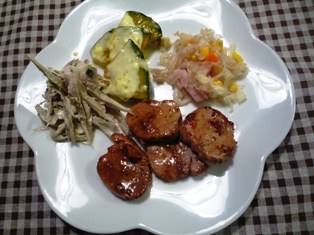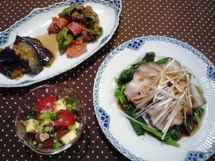 豚バラチャーシュー 小松菜添え(JUNAさんブログより)揚げなすの中華風ピーマンと豚こまの味噌炒めプチトマトとチーズのねぎ和え(てんきち母ちゃんちの毎日ごはん(3)より) * * * * * * * * * * * * *豚バラを使った簡単チャーシューです。国産豚肉を使ったのですが、なんだか脂身が多くて、イマイチでした(-_-;)チャーシューはやはり肩ロースくらいで作った方がアラフォーの胃には優しいかな・・・。揚げなすは香味野菜たっぷりの煮汁でさっと煮ています。なすだけのシンプルな夏らしいおかずです♪ピーマンと豚肉を炒めて甘みそ味で味付けた炒め物。味噌とピーマンは意外に相性がよく、ごはんが進む味です。プチトマトとプロセスチーズ、万能ねぎをごま油とおろしにんにくで和えたおつまみ風。簡単でとってもおいしかったので、ひと味違ったトマトの食べ方として覚えておこう~!と思いました(*^_^*)