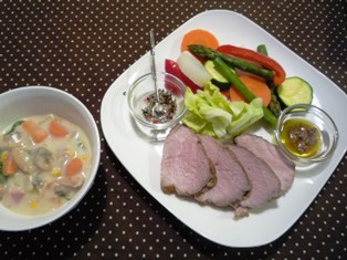 タンドリーチャーシュー(トイロ家のおいしいごはんより)蒸し野菜 ハーブ塩&バーニャカウダソース添えクラムチャウダー * * * * * * * * * * * * *豚肩ロース肉を前日からタンドリーソースに漬け込み、当日はオーブンで焼くだけでできました。レシピでは豚バラ肉でしたが、我が家の男性陣は肉の脂身が苦手なので(←きれいに残す!)今回は肩ロースを使いました。かたまり肉が大きすぎたのか、丸一日漬けこんでも、味の染みはイマイチ((+_+))タンドリーではなく、ただの焼き豚になってしまいました。その代わり、蒸し野菜用のハーブ塩でもバーニャカウダソースでもOKで、それぞれで楽しみました♪蒸し野菜はシリコンスチーマーを使いました。キャベツ、ズッキーニ、パプリカ、大根、にんじん、アスパラなど、たっぷりの野菜が手軽にとれますハーブ塩は粗塩、ローズマリー、ピンクペッパー、にんにくを一緒に刻みながら混ぜたもの。バーニャカウダソースはおろしにんにく、アンチョビ、オリーブオイル、牛乳を合わせて作っています。どちらもおいしかったのですが、にんにくがたっぷりでかなり匂ったかも(^_^;)クラムチャウダーは手軽に冷凍のあさりのむき身を使って作りました。具は他に、玉ねぎ、ブロックベーコン、にんじん、セロリ、コーンなど。忙しい時は具だくさんの汁物が助かります本日の塾弁。ほぼ夕食のメニューをそのまま詰めました。ハーブ塩が教室で匂ったかも * * * * * * * * * * * * *今日はテニススクールのお友達とスクール仲間の方が副料理長をしているホテルの和食レストランへランチに。夜はちょっと敷居が高いイメージのお店でしたが、お昼はお手頃価格のランチが揃っていて、味もお値段も大満足メンバーは、テニス以外の共通点はあまりないにもかかわらず、大いに盛り上がりました。奥のお席にしてもらっていてよかった・・・(^_^;)笑いすぎて、帰宅したら、思いっきりファンデーションが笑い皺に沿ってヨレてました在庫限り数限定(VIV ヴィヴ) シリコンスチーマー Due(デュエ) スチームトレイ付き