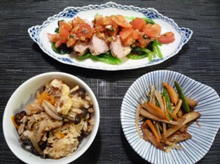 塩昆布の炊き込みごはん(トイロ家のおいしいごはんより)タンドリーチャーシューのトマトナムルのせ(トマトナムルはてんきち母ちゃんちの毎日ごはんより)五目きんぴら(ごちそうさまが、ききたくて。より) * * * * * * * * * * * * *たっぷりの塩昆布がメインで、あとはにんじん、しめじ、油揚げが少々。あっさり味の炊き込みご飯です。夫が飲み会だったので、結構残ってしまった昨日のタンドリーチャーシュー((+_+))今日はゆでた小松菜を敷き、トマトのナムルをのっけてリメイクしました。ナムルはおろしにんにく、万能ねぎ、みじん切りの玉ねぎ、ごま油、お醤油などで調味。トマト好きの娘は作っている時からボウルをのぞき込み、ウキウキお肉なしでこれだけで食べてました^^;五目きんぴらは、ごぼう、じゃがいも、にんじん、いんげん、さつま揚げ入り。こういう地味なきんぴらは意外に子どもたちのウケがよく、たっぷり作ってもその日のうちになくなります(^_^)v本日の塾弁。息子はトマトが苦手なので、お肉はチキンの照り焼きに。五目きんぴらはそのままで(はみ出してます)、野菜はキャベツのゆかり和えにしました。