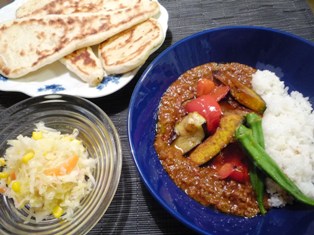 夏野菜のカレーらっきょう酢のコールスローナン * * * * * * * * * * * * *夫が飲み会で夕食いらずだったので、母子3人の夕食。こういう日はかなり高い確率で、カレーかマーボー豆腐が登場(^_^;)子どもたちの大好物で、作るのが簡単で、洗いものが少ないのがポイント今日は刻んだ野菜のたっぷり入った挽き肉のカレーに、揚げた夏野菜をトッピング。何もたっぷり焼きました。朝食はパンではなく、たった一人ご飯党の息子ですが、ナンは別。大好きで、カレーの時は、ご飯も食べたうえ、さらにナンを2枚は食べます