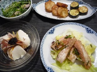 鮭ハラスの塩ねぎソース長いもの青のり揚げ&ズッキーニの天ぷら水菜と豚バラ肉の煮浸しみょうが&食べラーのせ冷奴 * * * * * * * * * * * * *今日は息子が修学旅行から帰ってくる日!大好物の水ようかんを作っておきました。市販のこしあんと粉寒天ですぐにできます。目下歴史オタクの息子は、日光がとても楽しかったようで、疲れた様子ではありましたが、とっても嬉しそうにあれこれ話してくれました※わたがし1566さんコメント欄に何度書き込んでもなぜかエラーになってしまうので、こちらにお返事書きますね。すみませんm(__)mカロリー高いだろうな~と思いつつ、ハラスや霜降りってやっぱりおいしいですよね。親の心配とは裏腹に、子どもはこういう宿泊行事、とーっても楽しいみたいです。息子もとにかくハイテンションで帰宅しました。息子さんも楽しんでこられるといいですね(*^_^*)水ようかんは、お水とお砂糖、粉寒天を煮立てて、こしあんを加えるだけでできるので、うちではゼリー代わりによく作っています♪