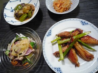 鶏手羽中のコチュジャン焼き(こうちゃんの簡単料理レシピ(3)より)かつおのたたきサラダなすとピーマンのおろし煮(こうちゃんの簡単料理レシピ(3)より)にんじんと春雨のツナ炒め(てんきち母ちゃんちの毎日ごはん(3)より) * * * * * * * * * * * * *手羽中をあらかじめコチュジャンベースのたれに漬け込んでおき、食べる直前にオーブンのグリル機能を使って焼くだけでできました♪辛いものが苦手な息子が塾弁で別メニューだったので、試してみたおかずです。簡単で、おいしく、手間なしでしたかつおのサクをにんにくの香りを移した油で表面だけ焼きつけ、簡単なたたきにし、野菜と合わせてサラダ仕立てにしました。野菜は大根、みょうが、しそに、ためしてガッテンの玉ねぎドレッシングを合わせています。なすとピーマンを炒めた後、薄味の煮汁で煮て、大根おろしを加えて仕上げた煮物。冷やしていただく夏向きの煮物です。にんじんの炒めものは、しらたき、ツナと炒め合わせて、お醤油とお酒でシンプルに味付けしたおかずですが、子どもたちに大人気お弁当にもぴったりです。 * * * * * * * * * * * * *わたがし1566さん夕食の献立作りに行き詰まると、レシピ本をパラパラめくるのが趣味なんです^_^;こうちゃんレシピはカロリー高め、味も濃いめのものが多いのですが、家族にはおおむね好評ですよ♪