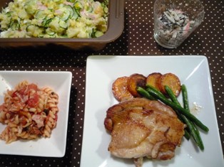 チキンソテー ハーブ塩添え(ふだんのおかず12か月より)トマトソースのショートパスタ(YOMEの楽チン・レシピ(2)より)ポテトサラダ大根とひじき、かにかまのサラダ * * * * * * * * * * * * *鶏もも肉をフライパンで焼きつけ、ふたをして中まで火を通します。厚手の南部鉄のフライパンを使うと、表面はカリッと中はジューシーにやわらかく仕上がりますごくフツーのスーパーの鶏肉を焼いただけなのに、とってもおいしくなりました付け合わせは鶏肉から出てきた油で焼き、旨みを吸わせたにんじん&いんげん。肉も野菜もいっさい下味はつけず、そのまま焼いています。チキンに添えたのは、にんにく、ローズマリー、ピンクペッパーを合わせて刻み、粗塩と混ぜた自家製ハーブ塩です。レシピでは赤唐辛子も入っていましたが、子ども向けに省きました。それでも十分おいしかったです多めにできたので、残りは蒸し野菜にも合わせてみようと思いますパスタはお鍋ひとつでできるお助けメニュー。ベーコン、玉ねぎ、にんにく、しめじをオリーブオイルで炒めて、ショートパスタ、トマト水煮缶、水を加えてふたをして火を通します。トマトソース好きの娘がほとんど食べましたポテトサラダはVIVシリコンスチーマーDUEを使ってじゃがいもを蒸し、そのままそのケースでじゃがいもをつぶしてきゅうり、ハム、ゆで卵と合わせ、マヨネーズで和えて、テーブルへ。洗いものが減って、気分的にとても楽チンでした。 * * * * * * * * * * * * *今日は娘の歯科治療の付き添い。定期健診で通っている間はよかったのですが、虫歯治療が始まってからは、ずっと診ていただいていた先生も匙を投げるほど大騒ぎ。「僕ではこれ以上は難しいです」ということで、ベテランの小児歯科専門の先生を紹介していただく羽目に前回はその先生でも大絶叫してしまい、今日も行く前から憂鬱だったのですが、諦めがついたのか、先生との信頼関係が生まれたのか、大人しく治療を受けることができました。診察室にはBGMが静かに流れているのですが、先生が「今日は音楽が聞こえますね(*^_^*)よかったですね~」とおっしゃるほどなんとか全身麻酔にはならず、通って治療を続けられそうで、ホッとしましたフランス ブルターニュ産の塩中挽きフルールドセル 400gviv(ヴィヴ) シリコン スチーマー DUE(デュエ)