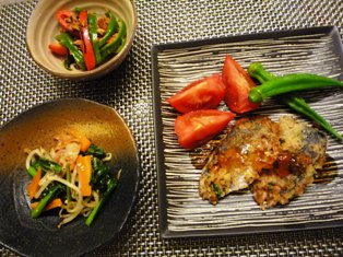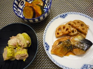 サバの味噌煮(もてなし上手より)白菜と豚バラ肉のロール(栗原はるみさんレシピより)かぼちゃとさつま芋のピリ辛煮(つくりおきおかずで朝つめるだけ!弁当より) * * * * * * * * * * * * *なんだか季節外れの献立です・・・^^;真さばが安かったので、今日は迷わずサバ味噌にしました♪うちは長年栗原はるみさんのレシピで作っています。味が濃すぎず、ちょうどいい味加減れんこんを添えるのも気に入っています。今日初めて試したかぼちゃとさつま芋の煮物ですが、ほんの少し豆板醤が入ることで、甘ったるくなりがちなイモ系の煮物の味がピリッと引き締まり、男性陣にも好評の味になりましたゆかり豚(てんきち母ちゃんちの朝15分でお弁当より)ピーマンとじゃがいものきんぴら(つくりおきおかずで朝つめるだけ!弁当より)大根と帆立のサラダ * * * * * * * * * * * * *