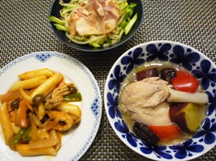 洋風サムゲタン(「ストウブ」のおいしい使いこなしレシピより)トッポギ&野菜炒め蒸し鶏入り野菜サラダ * * * * * * * * * * * * *丸鶏を使ったサムゲタンですが、ひと味違った洋風になっています♪お腹にもち米やナツメ、香味野菜を詰めるところは同じですが、セロリやパプリカ、さつまいも、ローリエ、クローブなどと一緒に煮込んでいます。ポトフのような味わいです。トッポギ炒めには、玉ねぎ、にんじん、ピーマン、しめじなどを合わせました。味付けはヤンニョムとみりん。新大久保で買ってきたヤンミョムは、辛味の中にも旨さがあって、おいしいーーサラダに入れた蒸し鶏は、つくりおきおかずで朝つめるだけ!弁当のレシピ。蒸し鶏を香味野菜やごま油、お醤油を合わせたたれに漬け込んだもの。余熱で火を通すので、むね肉もしっとりやわらかく仕上がります。お弁当にもぴったり。【送料無料】「ストウブ」のおいしい使いこなしレシピ
