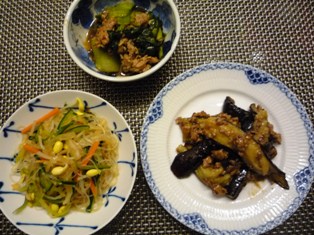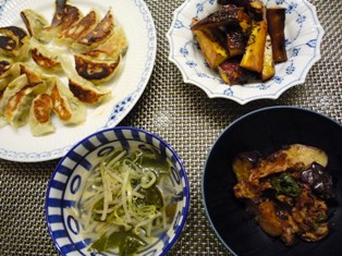 餃子なすと豚バラ肉の梅しそ炒め(てんきち母ちゃんブログより)大学芋もやしとわかめのスープ * * * * * * * * * * * * *