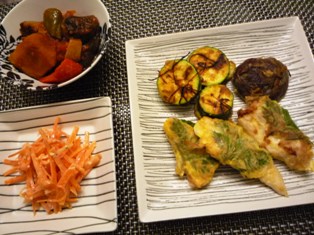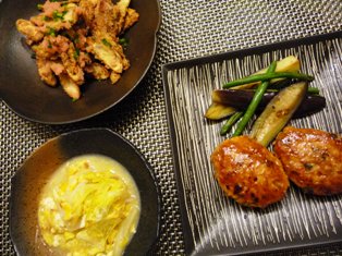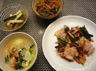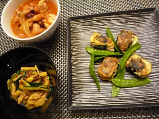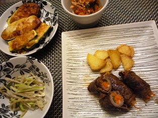 野菜の牛肉巻き&じゃがいもソテーなすとズッキーニの味噌チーズ焼きごぼうときゅうりのサラダキャベツキムチと豚しゃぶ肉の和え物 * * * * * * * * * * * * *千切りのにんじんとピーマン、プロセスチーズを牛肉で巻き、塩・こしょうとおろしにんにくで下味をつけ、小麦粉をはたいてから、バターでソテーしました。仕上げにお醤油を回しかけて完成♪お醤油+バター+にんにくという食欲をそそる香りの組み合わせですごぼうのサラダは辛子と味噌を少量加えたマヨネーズで和えています。今日はセロリの千切りもプラスしました。味噌チーズ焼きは、味噌をみりんで伸ばして野菜に塗り、ピザ用チーズをかけてオーブンで焼いたもの。子供たちにも人気のおかずですメインのお肉が意外にボリューム不足だったので、賞味期限の迫っていたキャベツキムチと、さっとゆでたしゃぶしゃぶ用の豚肉を合わせて一品にしました。先日、新大久保で買ってきたこのキャベツキムチ、ほんのり甘くて、辛いものに弱い我が家でもそのまま食べられる控えめな辛さ。歯ごたえも白菜のキムチとは少し違っていて新鮮です