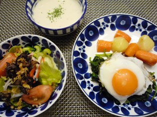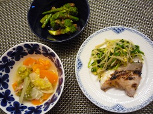 ぶりの塩麹焼きもやしと豆苗のソテー白菜とにんじん、パプリカの蒸し煮(圧力鍋のもっと絶品おかずより)ブロッコリーとアスパラの胡麻和え(栗原はるみさんレシピより) * * * * * * * * * * * * *昨日近所のショッピングセンターで輸入食器フェアをやっていて、ロールストランド社のモナミシリーズのボウルを見つけましたネットで見て、前から気になっていたシリーズだったので、実物を見て重さや色合いを確かめ、やっぱり欲しい~!と。一瞬ぎゅーぎゅーの食器棚が頭をよぎりましたが、結局購入(^_^;)北欧らしい大ぶりの花のデザインですが、藍色なので和食にも合いそう。【ユーロ安円高還元35%オフ】ロールストランド モナミ ボウル 600ml ロールストランドはスウェーデンのメーカーらしい。気付くと北欧メーカーの食器が増えていました【アウトレット品SALE】45%引き★★★アウトレット(訳あり)★★★ イッタラ ティーマ ボウル 15cm ブルー胡麻和えの小鉢はこちら。フィンランドのイッタラです♪ロイヤルコペンハーゲン(Royal Copenhagen) プリンセス 19cmプレートフラットぶりを持ったお皿はおなじみデンマークのロイヤルコペンハーゲン♪本日の男子弁。豚しゃぶ肉のすき煮(つくりおきおかずで朝つめるだけ!弁当より)にんじんとツナの塩麹炒め( 〃 )玉こんにゃくの煮物まるぽて * * * * * * * * * * * * *