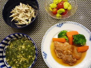 チキンの梅シロップ煮(つくりおきおかずで朝つめるだけ!弁当より)ブロッコリーとにんじんのグラッセプチトマトとそら豆のマリネごぼうと鶏酒蒸しのごまマヨ和えモロヘイヤの卵とじスープ(小林カツ代さんレシピ) * * * * * * * * * * * * *もとのレシピはマーマレードでしたが、梅ジャムがあったので、こちらで試してみました♪甘すぎず、爽やかな酸味がちょうどいい感じ!湯むきしたプチトマトと、さっとゆでたそら豆を市販のカンタンいろいろ使えま酢に浸しています。娘の大好物なので、すぐになくなってしまいます^^;モロヘイヤのスープは、夏になると思いだして作る味。10年くらい前のきょうの料理に載っていたものです。にんにくを炒めて、刻んだモロヘイヤを加え、だしを注いで、薄口醤油で味を調え、仕上げに溶き卵を回し入れて完成♪とろとろしたのどごしで、モロヘイヤに抵抗がある人でもOKな味ではないかと思います