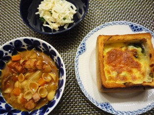 パングラタンミネストローネ大根と帆立のサラダ * * * * * * * * * * * * *今週、パン教室で角食パンを習いました。お教室では1/4斤を使ってパンケースを作ってトーストし、メイプルシロップとアイスクリームをのせて試食しました。かなりのボリュームでしたが、とーっても美味しかった家で子供たちにも作ってあげたら、やはり大ウケでした今日はそのパンケースの応用で、先生オススメのグラタンに。ゆでたほうれん草と鶏肉、シーフードミックス、しめじをホワイトソースで和え、ケースに詰めてチーズを散らしてオーブンで焼きました。息子からは「ちょっと食べにくい」と言われてしまいましたが、カリカリのトースト部分ととろ~っとしたグラタンのコンビネーションが抜群おいしくいただきました♪重ねトンカツちくわのチーズ&きゅうり詰めキャベツのゆかり和えさつまいもの黒ゴマ和え(つくりおきおかずで朝つめるだけ!弁当より) * * * * * * * * * * * * *昨日のパネソテーの衣が余ったので、豚ロース薄切り肉を重ねて衣をつけて重ねトンカツにしました。さつまいもはレンジで加熱し、ごま油、黒すりごま、みりんで和えてあります。甘すぎず、ごはんのおかずとして食べられる味です。