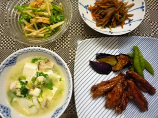 鶏手羽中の揚げ煮(てんきち母ちゃんレシピより)揚げなす&スナップえんどうごぼうとにんじん、ピーマンのきんぴら( 〃 )大根と水菜のサラダ鶏肉のトック(韓国温めごはんより) * * * * * * * * * * * * *手羽中を使った料理の中で、わが家的に人気ナンバー1のおかずがコレ小麦粉をはたいてからじっくりカリカリになるまで揚げた手羽中を醤油や水あめ、バルサミコ酢を煮立てたたれに絡めて仕上げます。骨からするりとはずれる状態になるまで揚げてあるので、子供たちにも食べやすいようです。味はこってり甘辛く、ごはんもお酒も進む味大根と水菜、トースターでカリカリに焼いた油揚げを合わせ、生姜、にんにく、長ねぎなどのみじん切りを加えたパンチのあるドレッシングで和えています。ドレッシングはごま油とお醤油、米酢に豆板醤を少々。水菜は少ししんなりするので、スジっぽい食感が苦手な息子もなんとか食べていました。先日、新大久保でトック(韓国のお餅)をたっぷり買ってきたので、せっせと使っています。トックは煮崩れないので、炒め物にしてもいいのですが、汁物に入れると白玉のような食感になって、子供たちも気に入っています今日はささみでだしをとり、三つ葉、豆腐、長ねぎ、溶き卵を入れました。ベーコン巻きハンバーグ じゃがいもソテー&ブロッコリーかぼちゃサラダキャベツとウィンナの粒マスタード炒め * * * * * * * * * * * * *ユウキ トック(切団子餅)/国産★税込1980円以上で送料無料★ユウキ トック(切団子餅)/国産(150g)