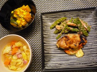 鶏肉のしそチーズ焼きいんげんとスナップえんどうの明太子炒め(つくりおきおかずで朝つめるだけ!弁当より)かぼちゃとコーンの甘煮ミネストローネ * * * * * * * * * * * * *鶏肉の厚みを開き、コチュジャンを塗って、しそとスライスチーズをはさみ、フライパンで焼きました。コチュジャンは新大久保で買った本場モノを使ったのですが、日本製のものよりも数段辛い辛いものに弱い我が家にはちょっと厳しそう~。お砂糖を足したり、お酢で割ったりして使うことにします・・・じゃがいもの牛肉巻き(みそ味)ごぼうのきんぴらほうれん草とコーンのジュレポン酢和え * * * * * * * * * * * * *昨日は友人とアメ横に行ってきました。今回は食材や化粧品ではなく、スポーツ用品のお買い物!学生時代からの友人たちですが、現在もテニス仲間で、同じくらいの子供をもつママ友でもあります♪今回は夏間近ということで、水着がたくさん出ていました娘の学校は温水プールがあり、夏の間は週3ペースでプールなので、水着がたくさんいります(^_^;)有名スポーツメーカーの水着が1000円以下で買えて、大満足濡れた水着をひとりで脱ぐのは、娘にとっては大変なのですが、セパレートタイプで、かつファスナーつきを見つけられて、ラッキーでした。ワンサイズ大きめのものまでまとめ買いしました(*^_^*)今回、自分のテニス用品は靴下くらいしか買えず・・・。水着はずいぶんオバサマ向けのデザインが増えた気がするのですが、夏のテニスウェアはまだまだ露出が多くて、アラフォーにはキツイ!