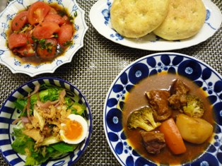 ビーフシチュー和風サラダ&ゆで卵の塩麹漬けトマトの甘酢漬けハーブ入りフォカッチャ * * * * * * * * * * * * *