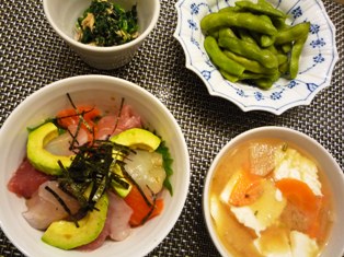 海鮮どんぶりほうれん草とツナのオイスターソース和え枝豆おぼろ豆腐入り味噌汁 * * * * * * * * * * * * *