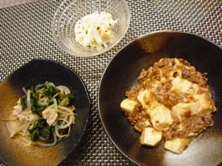 マーボー豆腐もやしとにら、豚バラ肉の塩麹蒸し(麹と酒粕のおいしい食卓より)大根と帆立のサラダ * * * * * * * * * * * * *