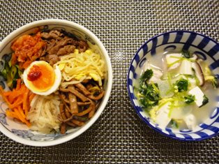 ビビンバトック * * * * * * * * * * * * *「きょうの料理」のサイトで見つけた本格派のビビンバ。牛肉のほか、大豆もやし、にんじん、きゅうり、大根、ぜんまい、キムチ・・・と具だくさんですしかもそれぞれをひとつずつ違った下ごしらえをするので、意外に時間がかかりました(^_^;)今日は温泉卵ではなく、半熟卵の塩麹漬けをトッピングしました。