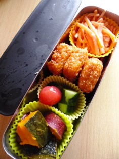 チキンカツにんじんの塩麹サラダきゅうりとプチトマトのマリネかぼちゃとさつまいものピリ辛煮 * * * * * * * * * * * * *ゆかりおにぎり鶏つくね金時豆の甘煮プチトマトときゅうりのマリネかぼちゃとさつまいものピリ辛煮ごぼうのきんぴら * * * * * * * * * * * * *今日は娘の宿泊学習!お昼は捨てられる容器でお弁当を持参です。娘の好きなものばかりを入れました(^_-)-☆新学期から運動会頃までは、ちょっと不安的な状態があり、心配していたのですが、このところ、とても機嫌よく毎日楽しそうに過ごせている娘とてもささやかな進歩ですが、洋服の前後とか、靴下の表裏とか、自分で確認するようになり、私がホメちぎると、ちょこっと嬉しそうな顔をします=^_^=宿泊学習も楽しめますようにーーー。そして夜は娘の学校のママたちとの飲み会♪携帯を気にしつつも、このメンバーで集まれるのは、年に1度の貴重な機会なので、思いっきり楽しんできました