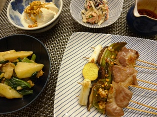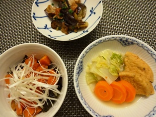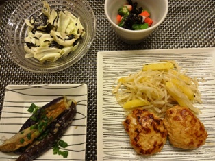塩麹鶏つくね(塩麹レシピ100より)もやしとじゃがいものソテーなすの白味噌焼き(塩麹&麹レシピより)キャベツとひじきの生姜風味サラダ(つくりおきおかずで朝つめるだけ!弁当(2)より)オクラとかにかま、きくらげの甘酢和え(栗原はるみさんレシピより) * * * * * * * * * * * * *お肉は、鶏もも肉とささみをフードプロセッサーにかけてひき肉にしたものを使いました。卵や粉類のつなぎは一切入らず、おろし玉ねぎと塩麹を加えただけのたねです。塩味がしっかりついているので、特にたれなどをかける必要もなく、そのままいただけます♪玉ねぎの効果でジューシーな仕上がりキャベツのサラダは、お醤油とお砂糖、生姜でサッと煮たひじきと生のキャベツを合わせています。レシピを何度も見ましたが、キャベツは生のまま・・・(・・?おいしくなくはないけれど、やはり塩もみするかゆでるかしたほうが食べやすそうです^^;なすは蒸しいためにしてから白味噌+塩麹を合わせたたれを絡めています。甘い白味噌がいい仕事してくれるので、お砂糖は不要。なすはあまり食べたがらない娘もこの味はお気に入りです