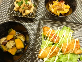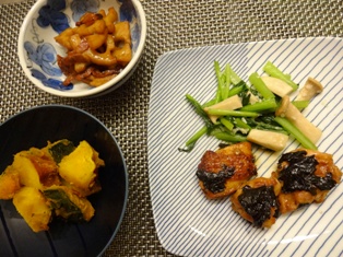 チキンの海苔照り焼き(つくりおきおかずで朝つめるだけ!弁当(2)より)小松菜とエリンギの塩麹炒めかぼちゃとさつまいものピリ辛煮( 〃 )れんこんとベーコンのきんぴら(ごちそうさまが、ききたくて。より) * * * * * * * * * * * * *鶏の照り焼きは子供たちの大好きなメニューですが、少々マンネリ気味。少し目先を変えてみたくて、レシピ本をめくっていたら、このメニューを発見お醤油とみりんで鶏もも肉を照り焼きにした後、仕上げに海苔をちぎって加えます。海苔の香りがあるので、調味料は控えめでOK。しっとりやわらかく、おいしかったです(*^_^*)かぼちゃとさつまいもの煮物はこのところよく作っています。コチュジャンを加えたピリ辛が新鮮!かぼちゃやさつまいもを使った煮物は甘いものが多いですが、ピリ辛味もなかなか。れんこんのきんぴらはワインビネガーとお醤油、お砂糖で調味しています。酸味が入ることで、ぐんと旨みが増すような気がします。ずっと作り続けているお気に入りの味です。